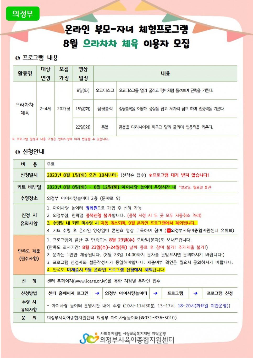 [의정부] 8월 온라인 부모-자녀 체험프로그램 '으라차차 체육, 텀블미술' 신청안내 > 공지사항