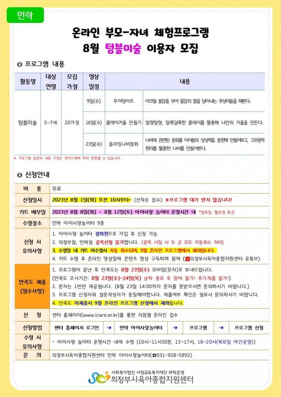 [민락] 8월 온라인 부모-자녀 체험프로그램 '으라차차 체육, 텀블미술' 신청안내 > 공지사항