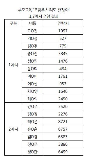 부모교육 '조금은 느려도 괜찮아' 1,2차시 추첨결과 페이지 정보 작성자 의정부센터 댓글 0건 조회 1,393회 작성일 2023-07-13 11:14 본문 축하 드립니다부모교육 '조금은 느려도 괜찮아' 1,2차시 추첨결과입니다. 목록 이전글2023년 2분기 후기 이벤트 당첨자 명단 23.07.13 다음글[민락] 8월 온라인 부모-자녀 체험프로그램 '으라차차 체육, 텀블미술' 신청안내 23.07.13