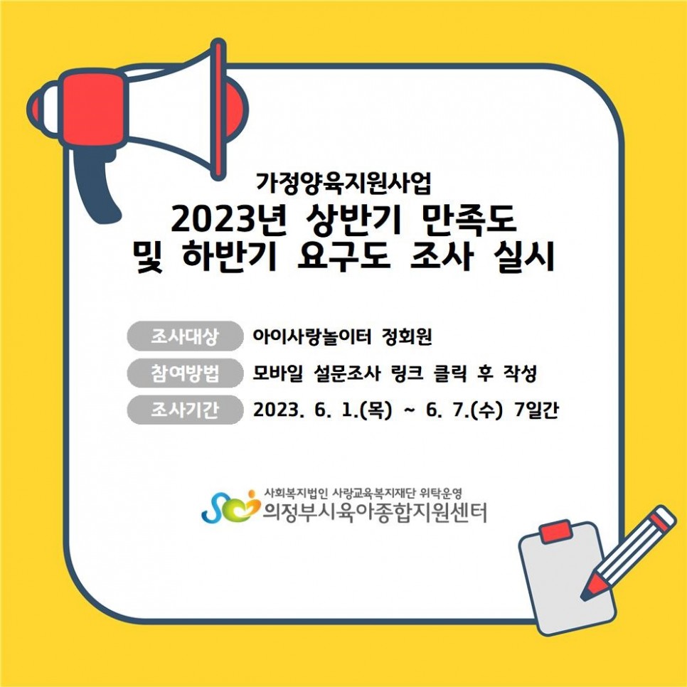 가정양육지원사업 23년 상반기 만족도 및 하반기 요구도 조사 실시 페이지 정보 작성자 의정부센터 댓글 0건 조회 1,347회 작성일 2023-05-30 14:33 관련링크 https://naver.me/GmVEbdbA 1072회 연결 본문 관련 링크를 클릭하시면 설문조사 페이지로 이동합니다 목록 이전글[민락] 놀이지도사가 알려주는 6월 '놀이가 쑥쑥' 놀이키트 배부 안내 23.06.01 다음글[런치특강]우리아이 이유있는 행동 이해하기 23.05.26