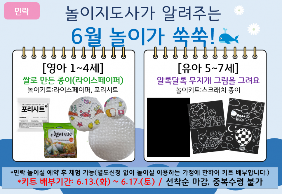 [민락] 놀이지도사가 알려주는 6월 '놀이가 쑥쑥' 놀이키트 배부 안내 페이지 정보 작성자 의정부센터 댓글 0건 조회 1,489회 작성일 2023-06-01 10:41 본문 별도의 신청을 진행하지 않으며, 해당 기간 내 민락 아이사랑놀이터 놀이실 예약 후 키트수령 가능합니다. 목록 이전글2023년 6월 휴관 안내 23.06.05 다음글가정양육지원사업 23년 상반기 만족도 및 하반기 요구도 조사 실시 23.05.30