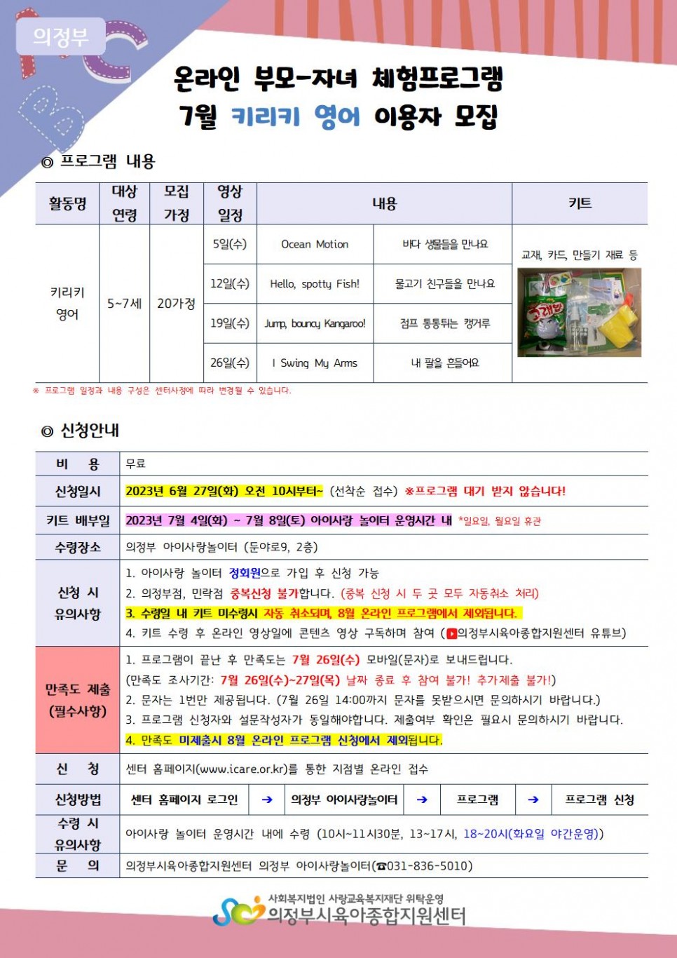 [의정부] 7월 온라인 부모-자녀 체험프로그램 '볼빵빵 아기다람쥐 오로로, 키리키 영어' 신청안내 > 공지사항