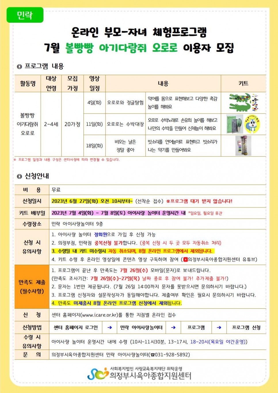 [민락] 7월 온라인 부모-자녀 체험프로그램 '볼빵빵 아기다람쥐 오로로, 키리키 영어' 신청안내