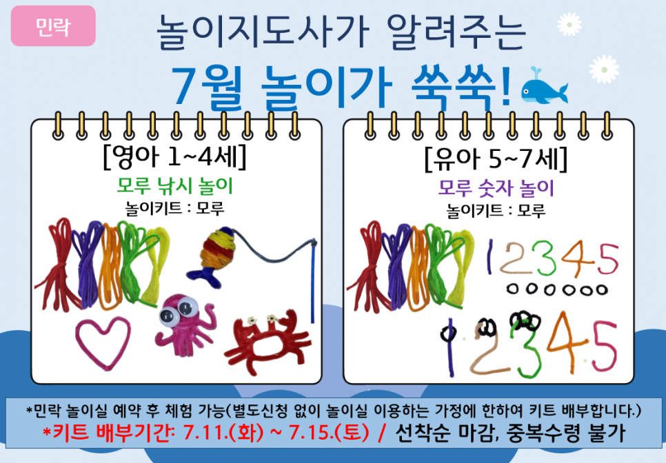 [민락] 놀이지도사가 알려주는 7월 '놀이가 쑥쑥' 놀이키트 배부 안내 페이지 정보 작성자 의정부센터 댓글 0건 조회 1,595회 작성일 2023-07-04 15:42 본문 별도의 신청을 진행하지 않으며, 해당 기간 내 민락 아이사랑놀이터 놀이실 예약 후 키트수령 가능합니다. 목록 이전글[민락] 부모-자녀 체험 프로그램 특강 '키즈발레' 이용자 모집 23.07.12 다음글[의정부] 2023년 7월 장난감 도서관 신규 장난감 입고 안내 23.07.04