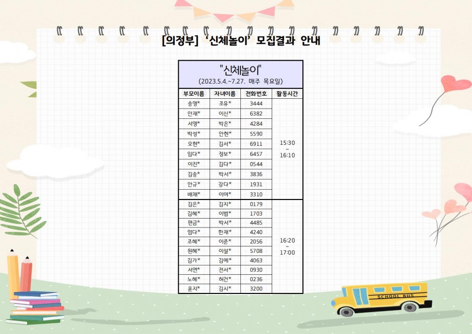 - 다음글[민락] 2023년 2기 부모-자녀 체험 프로그램 '뮤직아이, 신체놀이, 요리쿡 조리쿡' 모집결과 안내 23.04.18