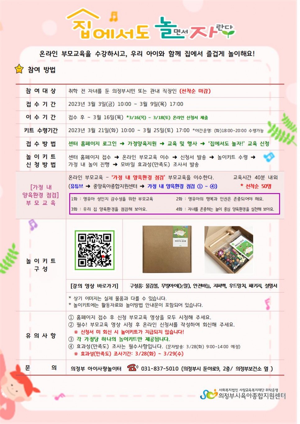 [공통부모교육] 집에서도 놀(면서) 자(란다) 모집 안내 페이지 정보 작성자 의정부센터 댓글 0건 조회 1,722회 작성일 2023-02-23 14:15 본문 온라인 수강 후 키트 활동으로 연계하는 교육 프로그램 입니다. 진행 방법과 일정 등을 꼼꼼하게 확인하신 후 신청 부탁드립니다. 목록 이전글[의정부] 2023년 3월 장난감도서관 신규 장난감 입고 안내 23.03.07 다음글[특화사업] 3월 부모-자녀 숲 체험프로그램 안내 23.02.23