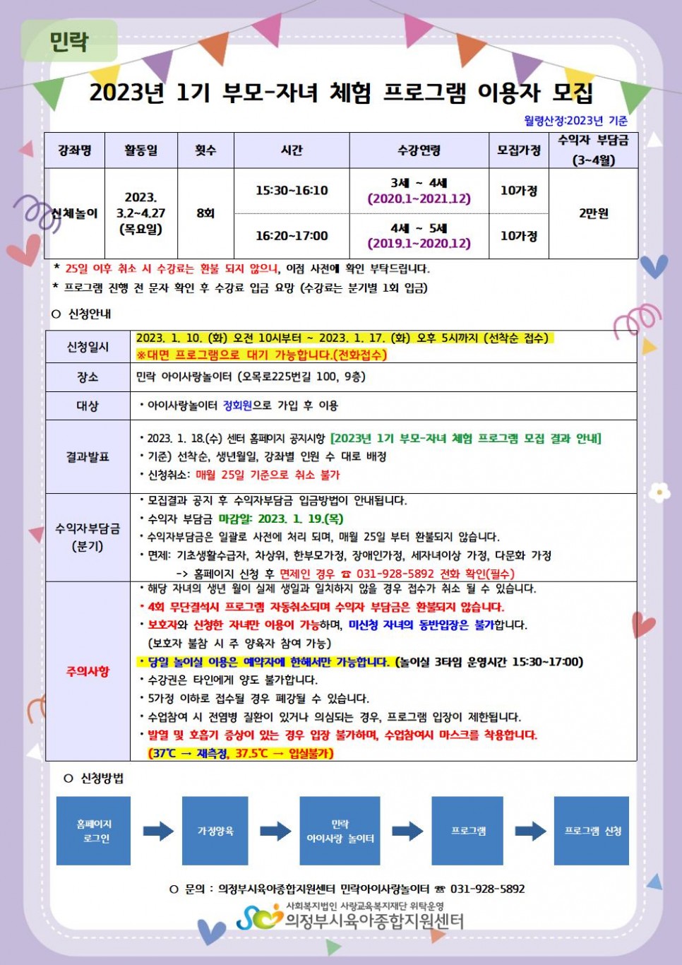 - 다음글[의정부]2023년 1기 부모-자녀 체험 프로그램 이용자 모집(깨비깨비 오감뚝딱, 신체놀이, 퍼포먼스 미술) 23.01.03