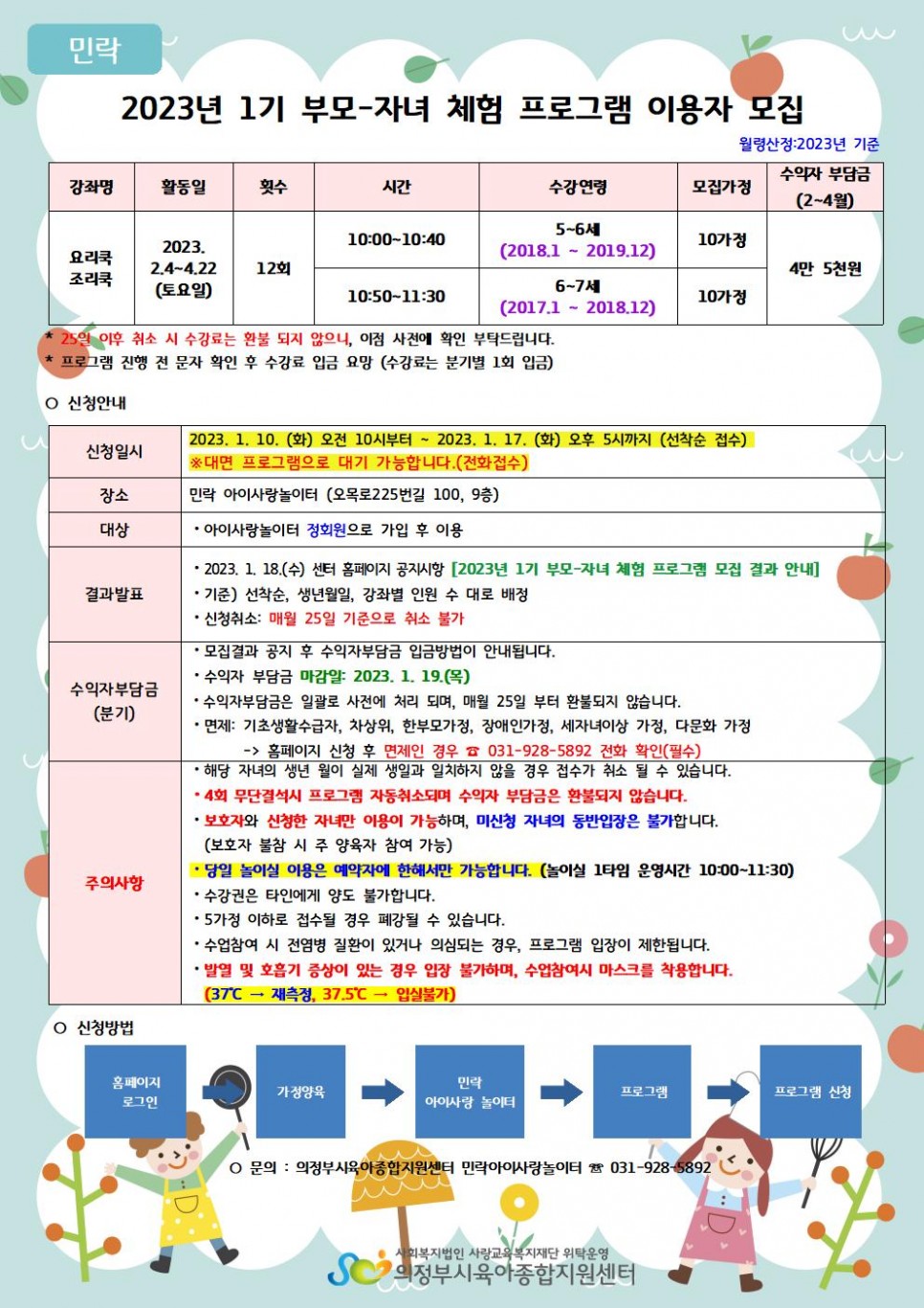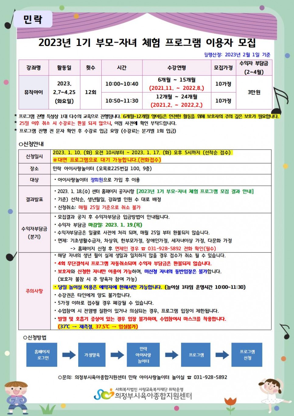 [민락]2023년 1기 부모-자녀 체험 프로그램 이용자 모집(뮤직아이, 신체놀이, 요리쿡 조리쿡)