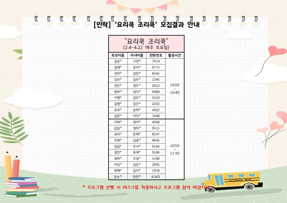 [민락] 2023년 1기 부모-자녀 체험 프로그램 '요리쿡 조리쿡' 모집결과 안내 > 공지사항