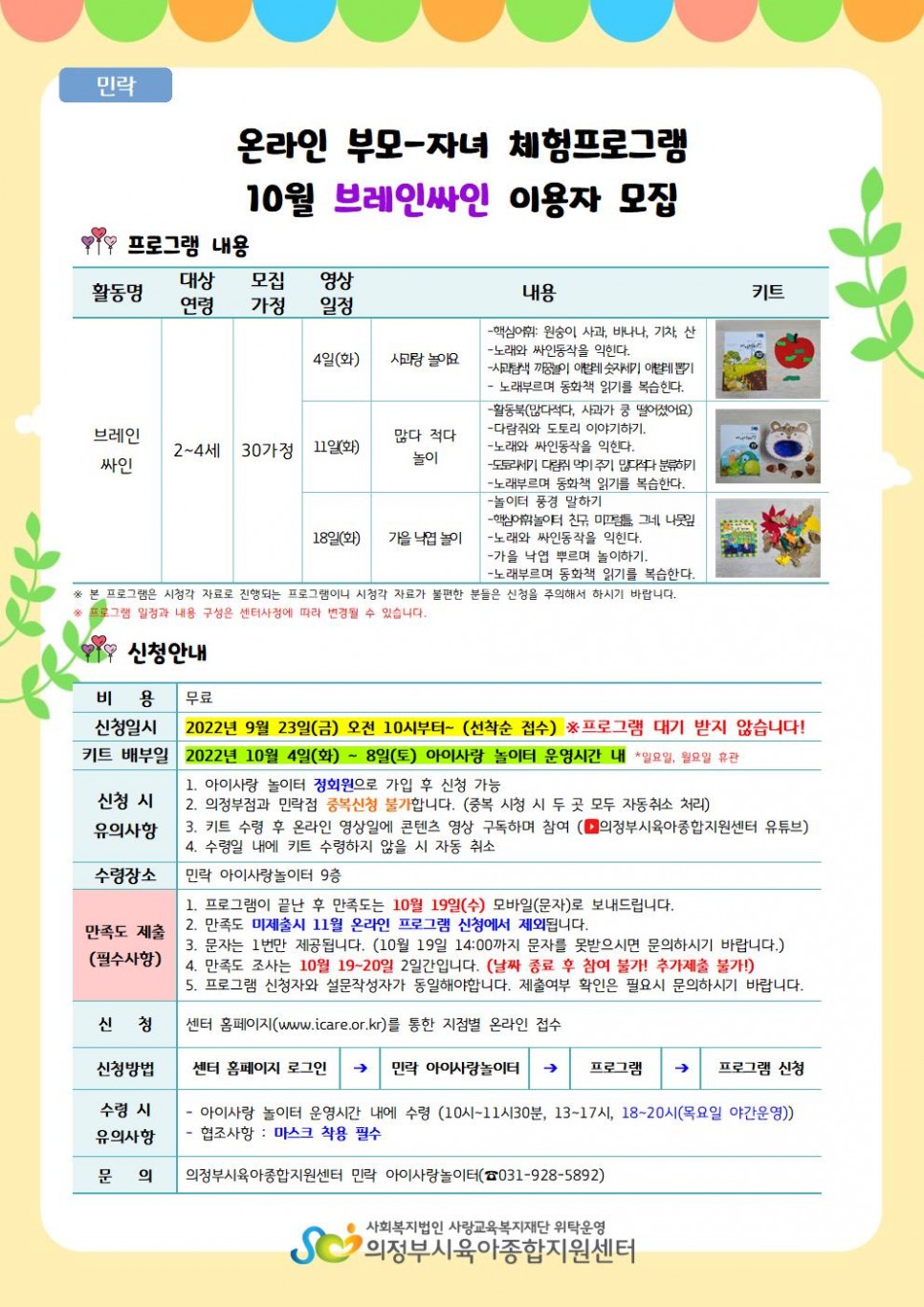 [의정부, 민락] 온라인 부모-자녀 체험프로그램 '브레인싸인' 이용자 모집(10월) 페이지 정보 작성자 의정부센터 댓글 0건 조회 1,885회 작성일 2022-09-16 09:44 본문 *10월 퍼니쿡과 키트배부날짜가 다르니 배부날짜 꼭!! 확인 후 신청해주세요. 목록 이전글[의정부, 민락] 온라인 부모-자녀 체험프로그램 '목공놀이' 이용자 모집(10월) 22.09.16 다음글[부모교육] 재능기부-캘리그라피 22.09.13