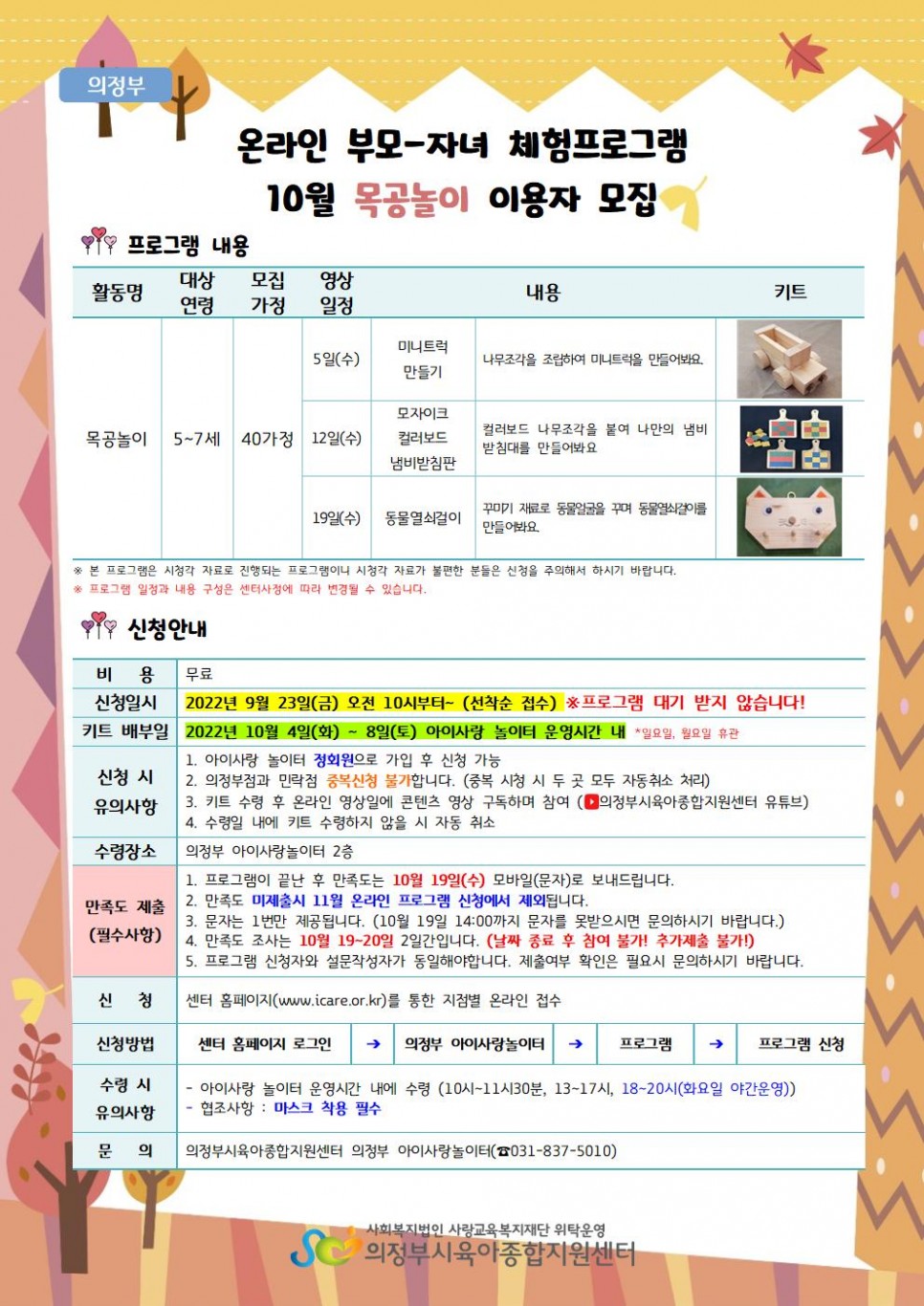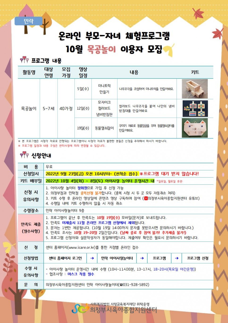 [의정부, 민락] 온라인 부모-자녀 체험프로그램 '목공놀이' 이용자 모집(10월)