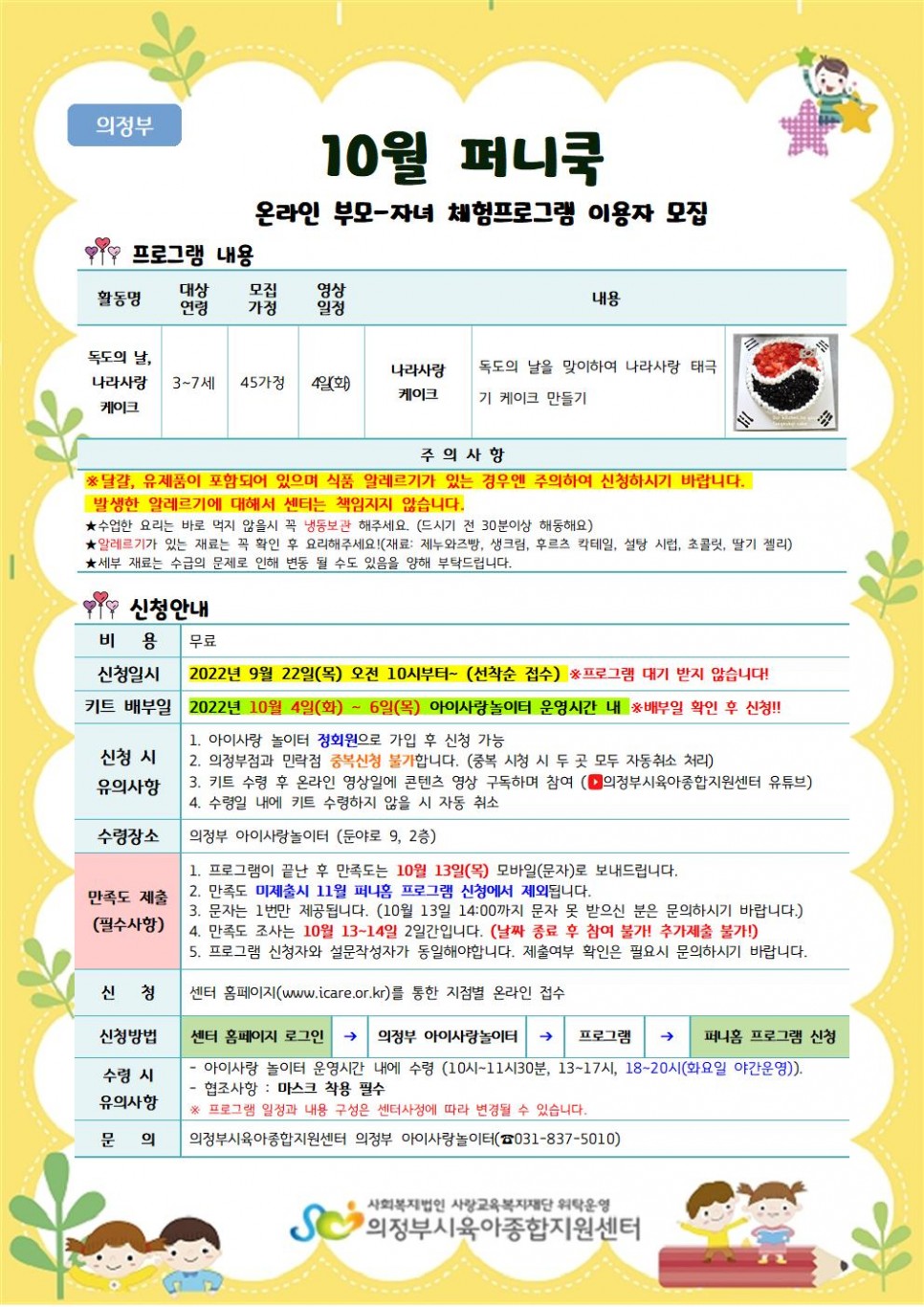 [의정부,민락] 퍼니홈 프로그램 모집 안내(10월) '독도의 날, 나라사랑 케이크' 페이지 정보 작성자 의정부센터 댓글 0건 조회 1,772회 작성일 2022-09-16 10:39 본문 *10월 온라인과 키트배부날짜가 다르니 배부날짜 꼭!! 확인 후 신청해주세요. 목록 이전글제8회 도담아이 사진 공모전 심사결과 22.09.16 다음글[의정부, 민락] 온라인 부모-자녀 체험프로그램 '목공놀이' 이용자 모집(10월) 22.09.16
