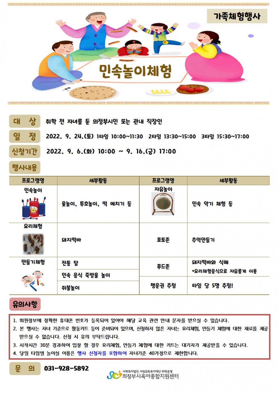 (민락) 가족체험행사 '민속놀이' 안내 페이지 정보 작성자 의정부센터 댓글 0건 조회 2,221회 작성일 2022-08-29 10:05 본문 행사 일정과 유의 사항 확인 후 신청 부탁드립니다.^^ 목록 이전글민락 아이사랑놀이터 주차장 공사 관련 안내(변경) 22.08.30 다음글독서연계 부모교육 22.08.25