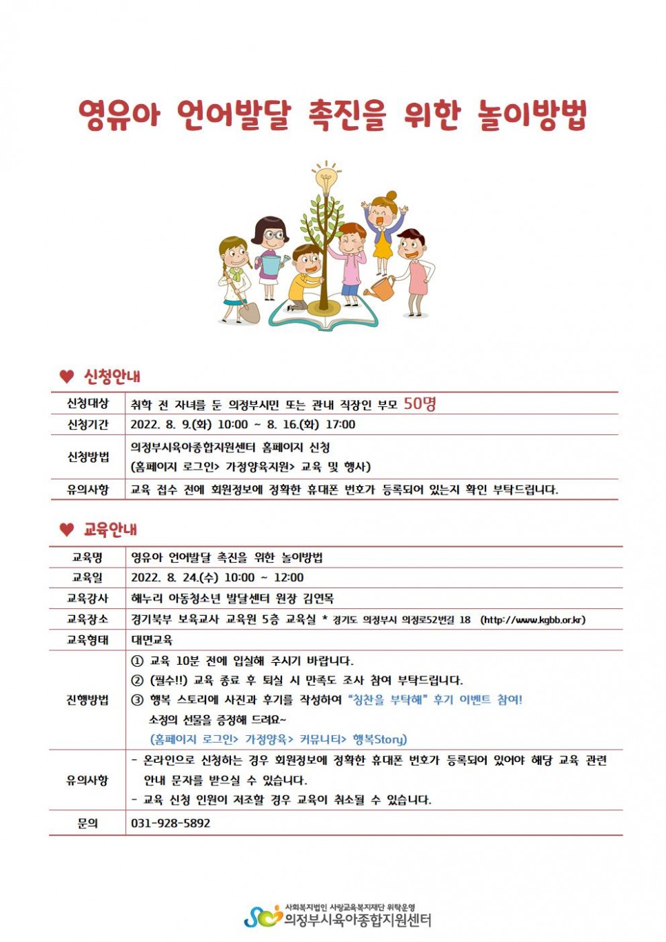 [부모교육] 영유아 언어발달 촉진을 위한 놀이방법 페이지 정보 작성자 의정부센터 댓글 0건 조회 2,322회 작성일 2022-08-02 11:24 본문 대면교육으로 교육장소 확인 후 신청 부탁드립니다. 목록 이전글[민락] 2022년 2기 부모-자녀 프로그램 모집안내(퍼포먼스 미술) 22.08.03 다음글[민락] 2022년 장난감도서관 한복 입고 안내 22.07.29