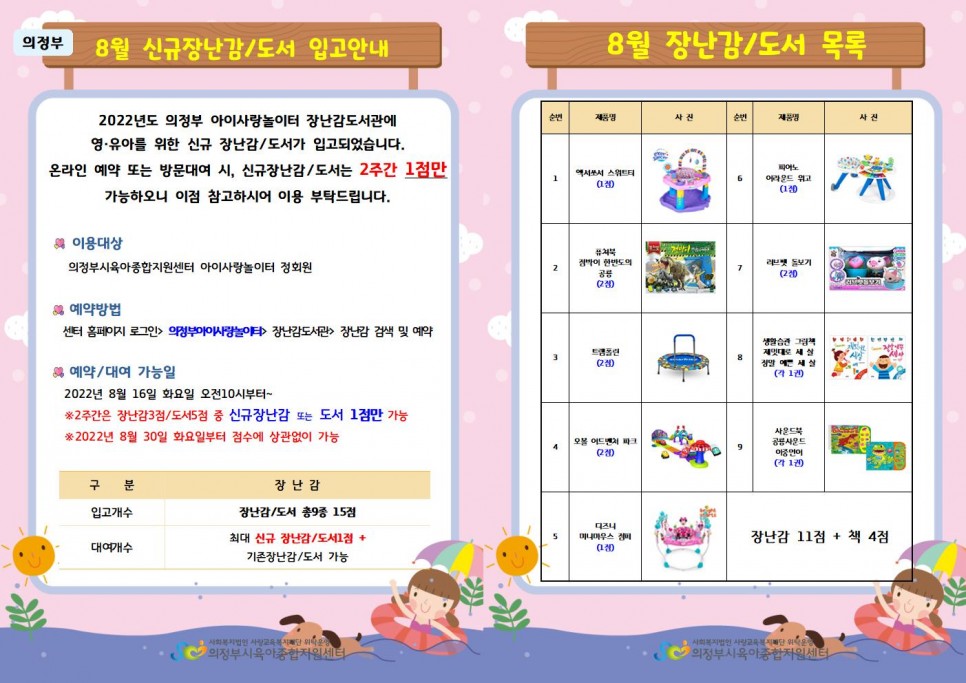 [의정부] 2022년 8월 장난감도서관 신규 장난감 입고 안내 페이지 정보 작성자 의정부센터 댓글 0건 조회 1,650회 작성일 2022-08-08 17:00 본문 [의정부] 2022년 8월 장난감도서관 신규 장난감 입고 안내 목록 이전글[의정부]부모-자녀 체험 프로그램 ‘8월 동화노리자람 프로그램 모집결과 안내’ 22.08.10 다음글'놀이를 부탁해' (놀이키트) 22.08.05