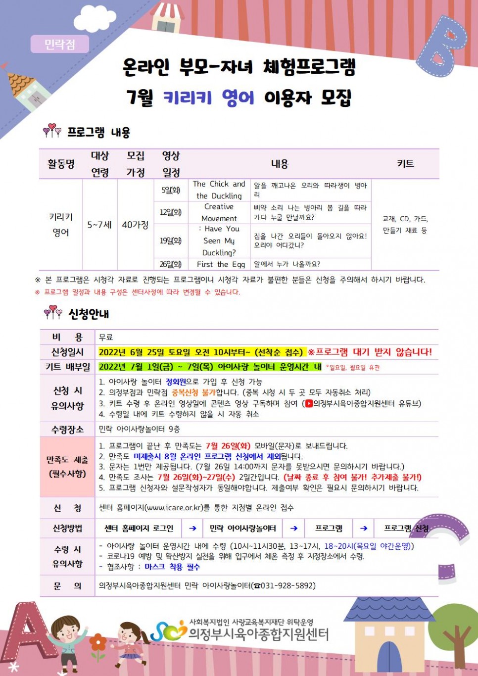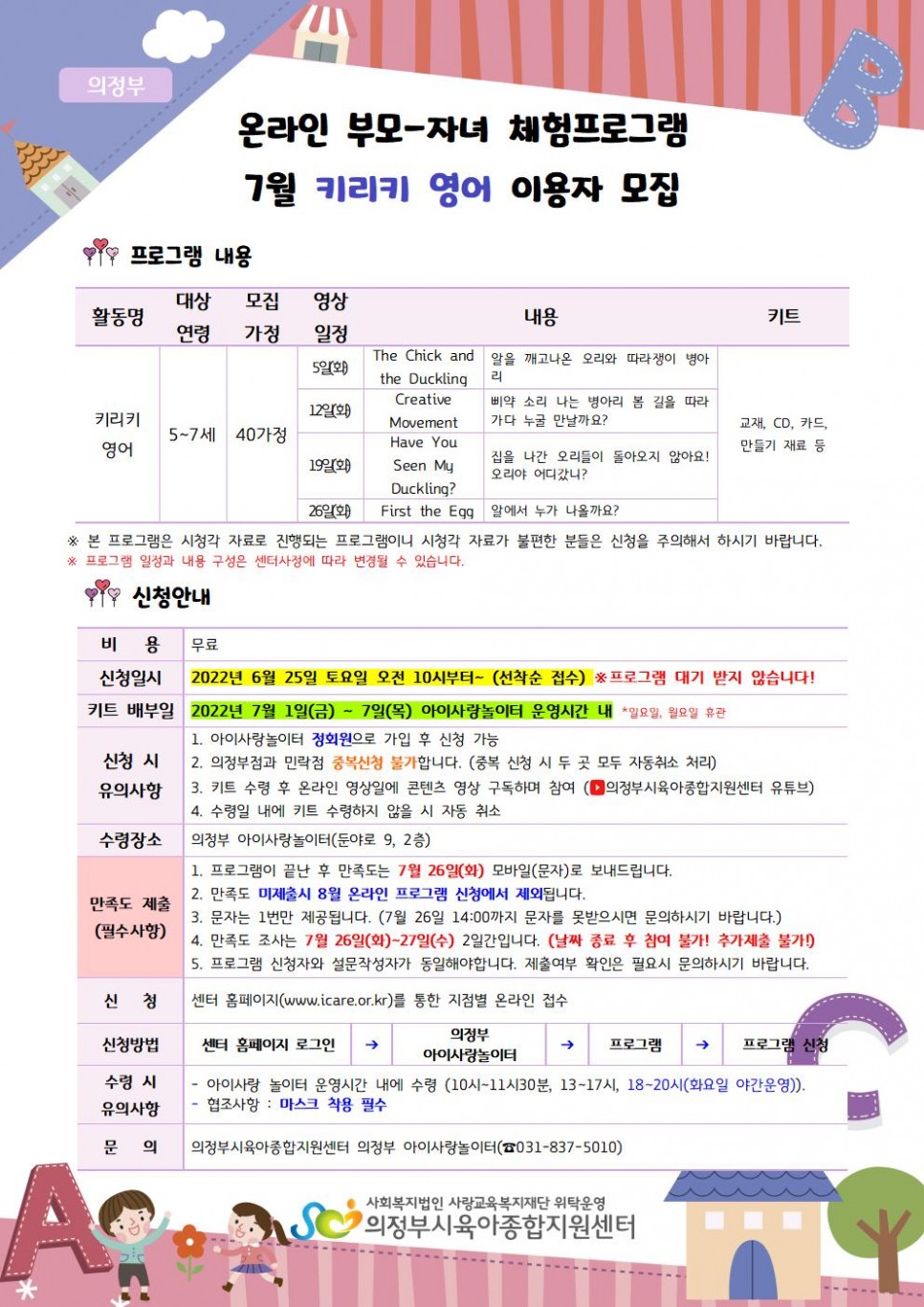 [의정부, 민락] 온라인 부모-자녀 체험프로그램 '키리키 영어' 이용자 모집(7월)