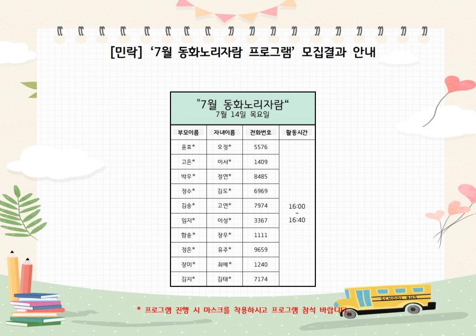 [민락]부모-자녀 체험 프로그램 ‘7월 동화노리자람 프로그램 모집결과 안내’