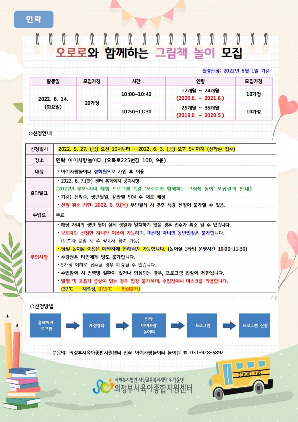 [민락] 2022년 부모-자녀 체험 프로그램 특강 ‘오로로와 함께하는 그림책 놀이’ 이용자 모집 페이지 정보 작성자 의정부센터 댓글 0건 조회 1,626회 작성일 2022-05-25 16:01 본문 ★ 신청하시기 전 안내문을 꼼꼼히 살펴보시기 바랍니다. 목록 이전글(부모교육) 발달지연에 따른 상호작용법 22.05.26 다음글[의정부] 2022년 부모-자녀 체험 프로그램 특강 ‘노리야 오감발달’ 이용자 모집 22.05.25