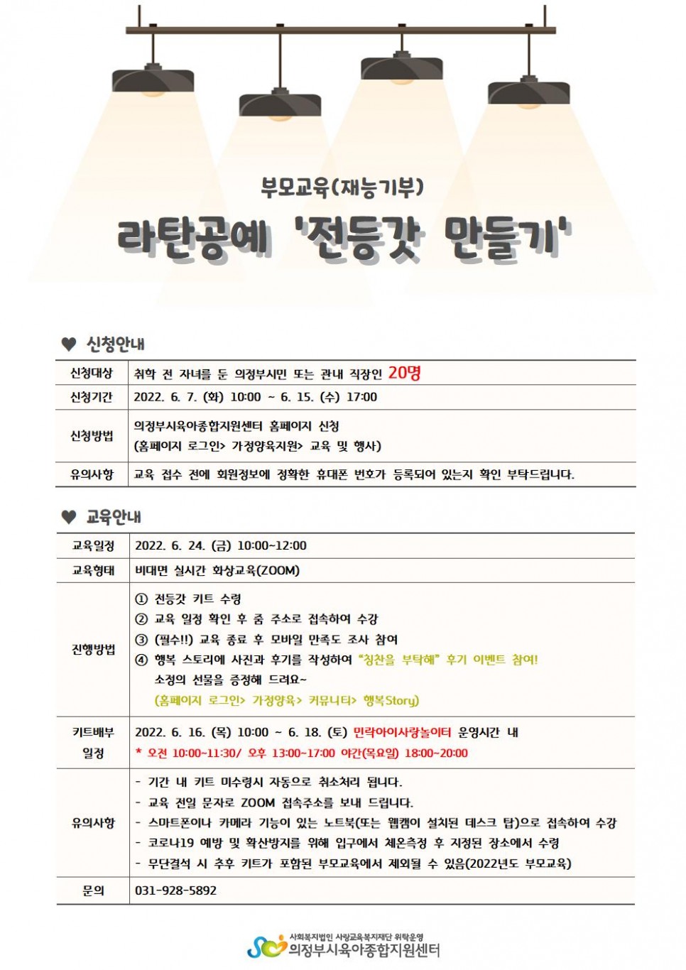 (부모교육) (재능기부) 라탄공예 '전등갓 만들기' 페이지 정보 작성자 의정부센터 댓글 0건 조회 2,287회 작성일 2022-05-26 15:00 본문 실시간 비대면 zoom 교육입니다. 교육 전 키트수령이 있습니다. 키트수령일을 참고해 주시고, 교육참여 가능하신 분만 꼭 신청부탁드립니다.^^ 목록 이전글[특화사업] 조부모 힐링 프로그램 - 공연 관람 및 카페 나들이 22.05.26 다음글(부모교육) 발달지연에 따른 상호작용법 22.05.26