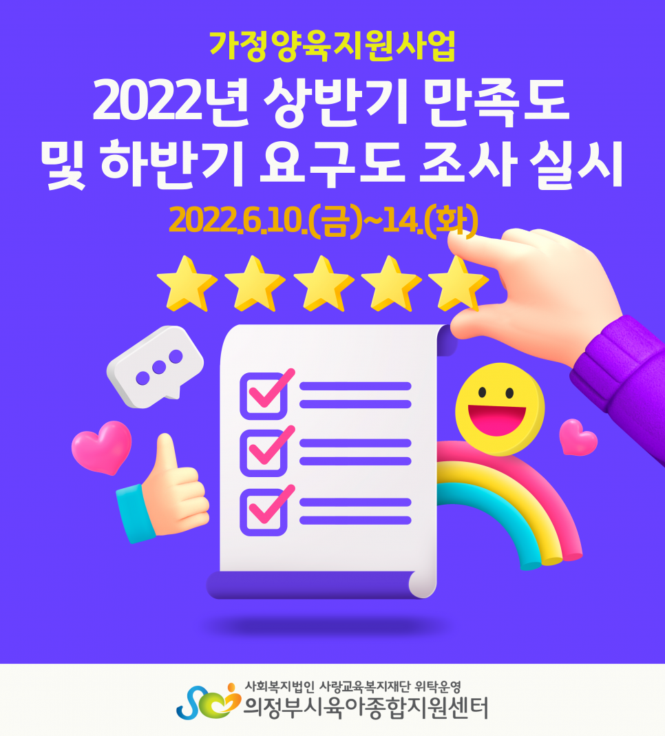 가정양육지원사업 22년 상반기 만족도 및 하반기 요구도 조사 실시 페이지 정보 작성자 의정부센터 댓글 0건 조회 1,783회 작성일 2022-06-13 16:38 본문 가정양육지원사업 22년 상반기 만족도 및 하반기 요구도 조사 실시 하오니 많은 참여 바랍니다. 목록 이전글[의정부] 2022년 6월 장난감도서관 신규 장난감 입고 안내 22.06.14 다음글출발! 놀이탐험대 영상 공모전 '집콕놀이! 소개를 부탁해' 22.06.10
