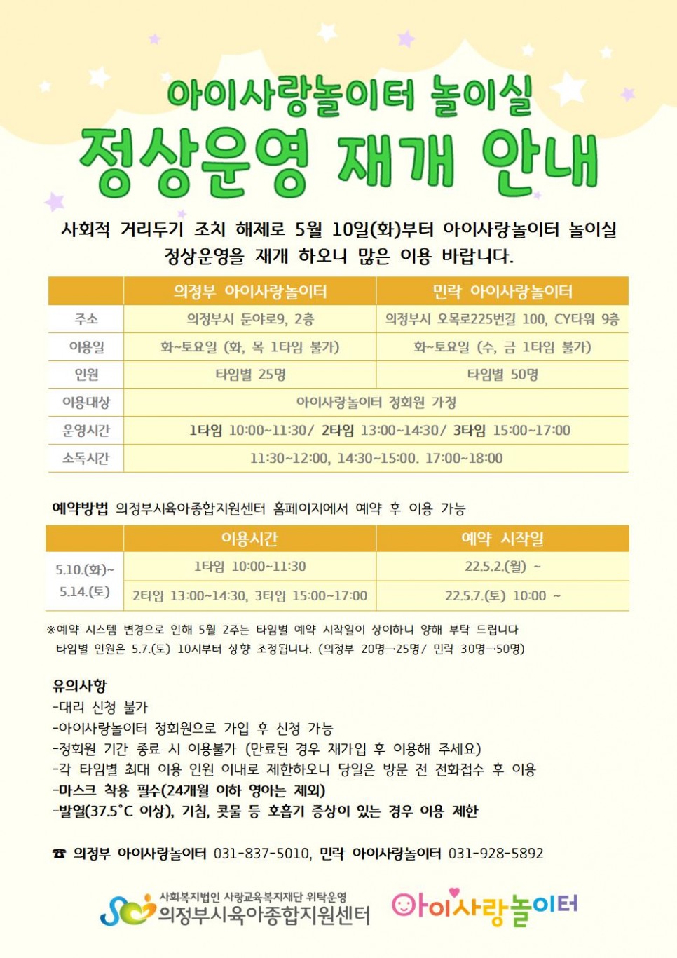 아이사랑놀이터 놀이실 정상운영 안내_22.5.10.(화)~ 페이지 정보 작성자 의정부센터 댓글 0건 조회 1,980회 작성일 2022-04-29 18:04 본문 아이사랑놀이터 놀이실 정상운영 안내_22.5.10.(화)~ 목록 이전글(부모교육) 부모힐링-타로 커뮤니케이션 22.05.03 다음글[민락] 2022년 5월 장난감도서관 신규 장난감 입고 안내 22.04.27