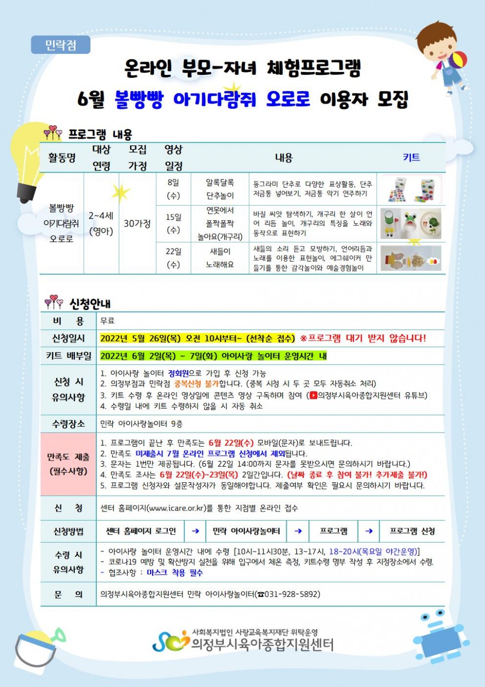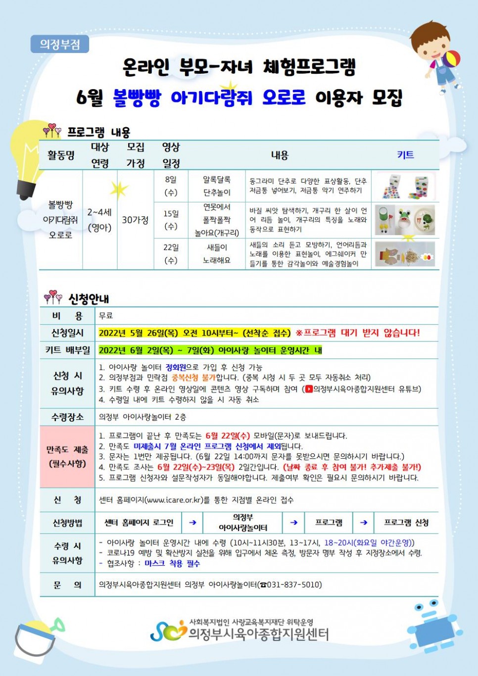 [의정부, 민락] 온라인 부모-자녀 체험프로그램 6월 '볼빵빵 아기다람쥐 오로로' 이용자 모집