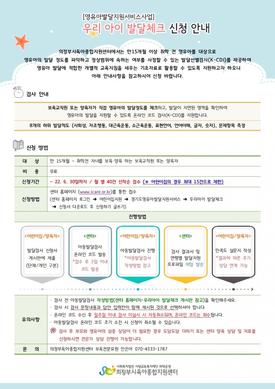 [영유아발달지원서비스사업] 우리아이 발달체크(K-CDI) 신청 안내 페이지 정보 작성자 의정부센터 댓글 0건 조회 1,813회 작성일 2022-05-24 16:11 본문 [영유아발달지원서비스사업] 우리아이 발달체크(K-CDI) 신청 안내 목록 이전글[의정부] 2022년 부모-자녀 체험 프로그램 특강 ‘노리야 오감발달’ 이용자 모집 22.05.25 다음글아이사랑놀이터 놀이실 운영시간 변경 안내 22.05.20