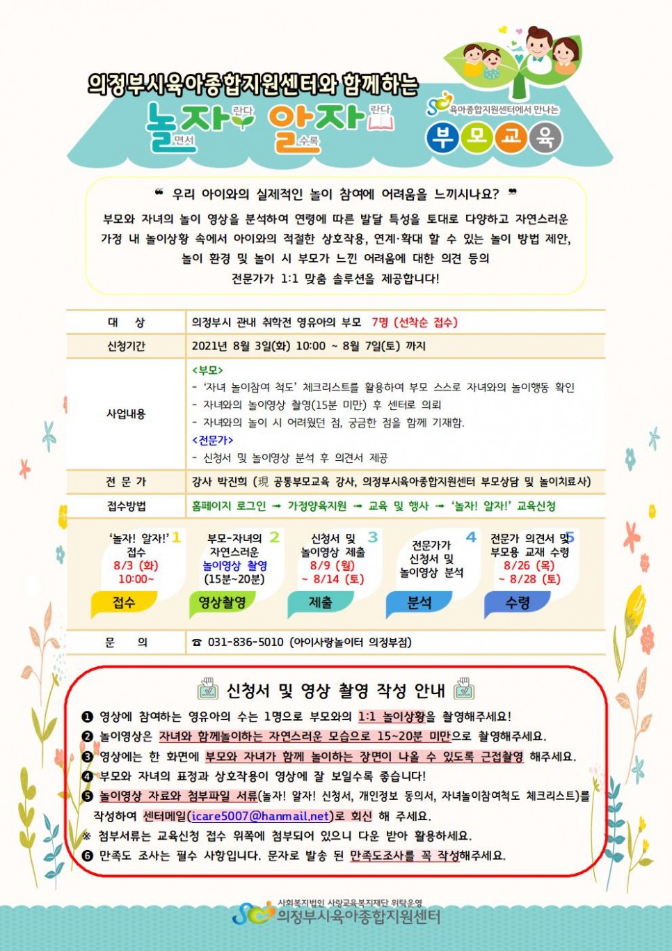 [부모교육] '우리집 금쪽이 처방전' 8월 놀면서 자란다 알수록 자란다 페이지 정보 작성자 의정부센터 댓글 0건 조회 2,256회 작성일 2021-08-03 13:43 본문 신청하러가기▶금쪽이 잘 자라고 있나요? 사전 신청 후 놀이영상을 보내 주시면 처방전을 알려 드립니다 목록 이전글[부모교육] 그림책으로 다가가는 다문화 감수성 교육 21.08.11 다음글[의정부] 부모교육 '어서와! 홈트레이닝은 처음이지?' 21.08.02
