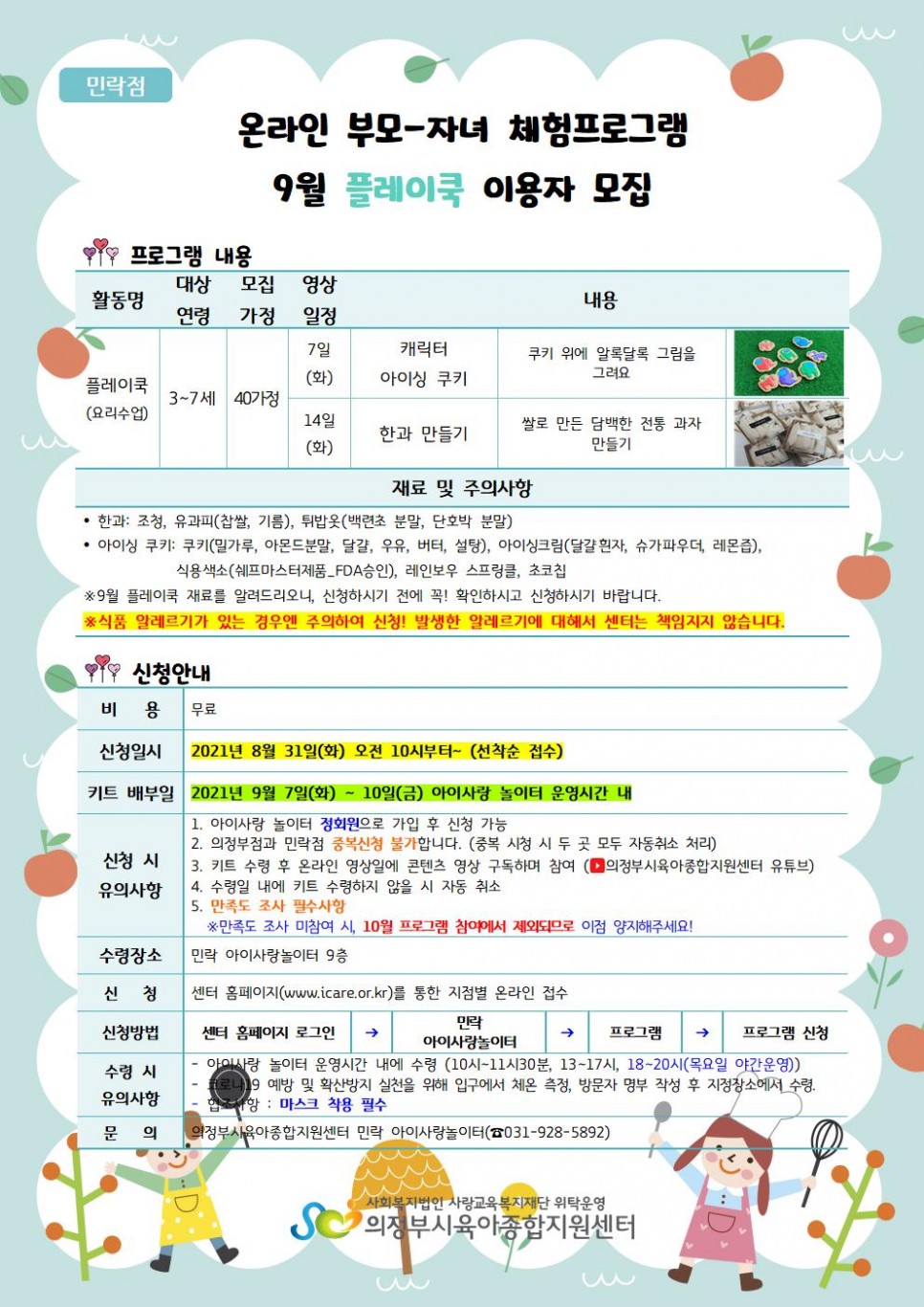 [의정부,민락] 온라인 부모-자녀 체험프로그램 9월 '플레이쿡' 이용자 모집 > 공지사항