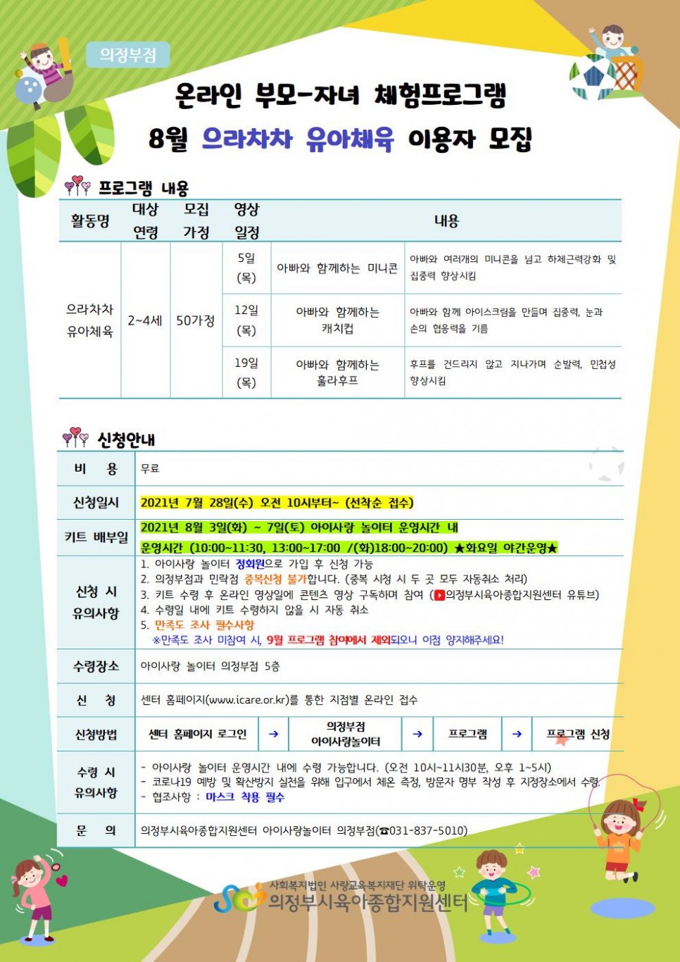 [의정부,민락] 온라인 부모-자녀 체험프로그램 8월 '으라차차 유아체육' 이용자 모집 > 공지사항