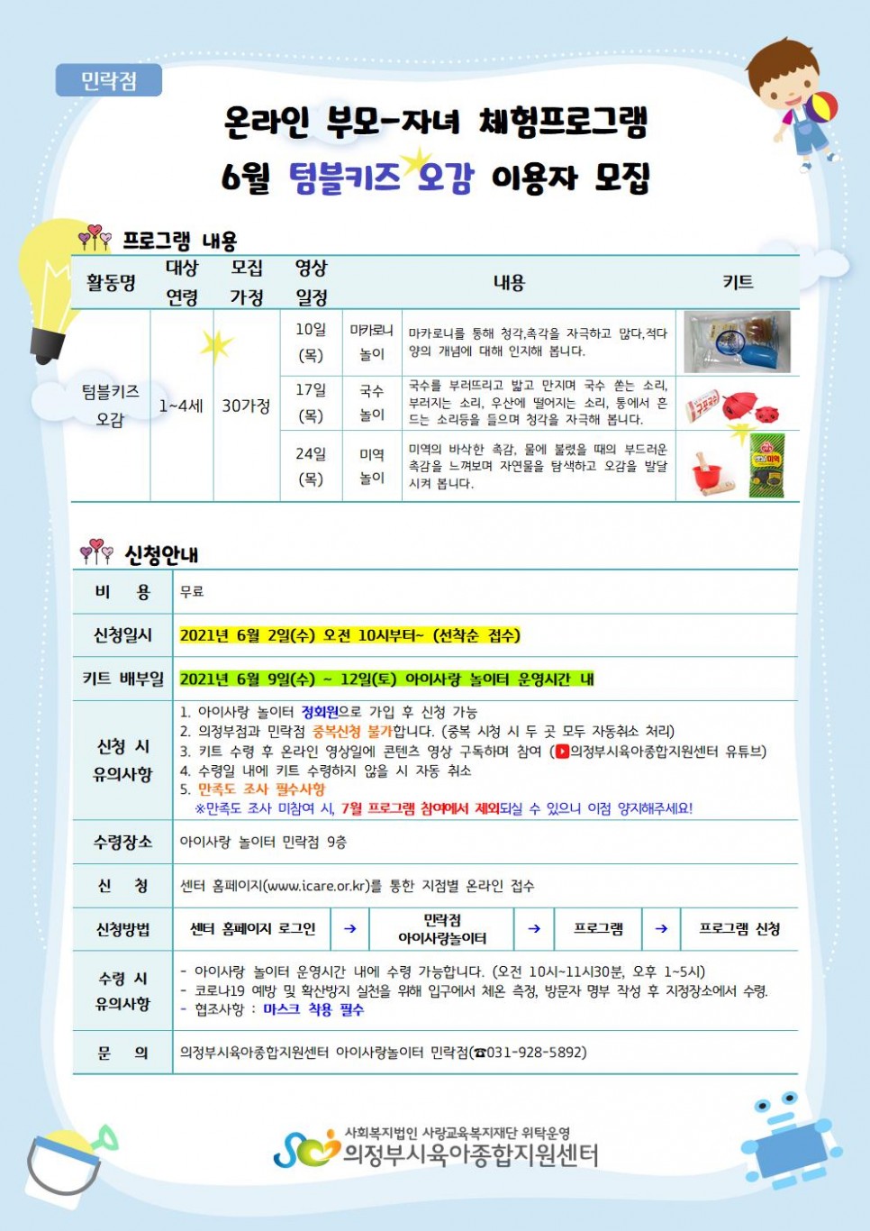 [의정부점,민락점] 온라인 부모-자녀 체험프로그램 텀블키즈 오감 6월 이용자 모집 > 공지사항