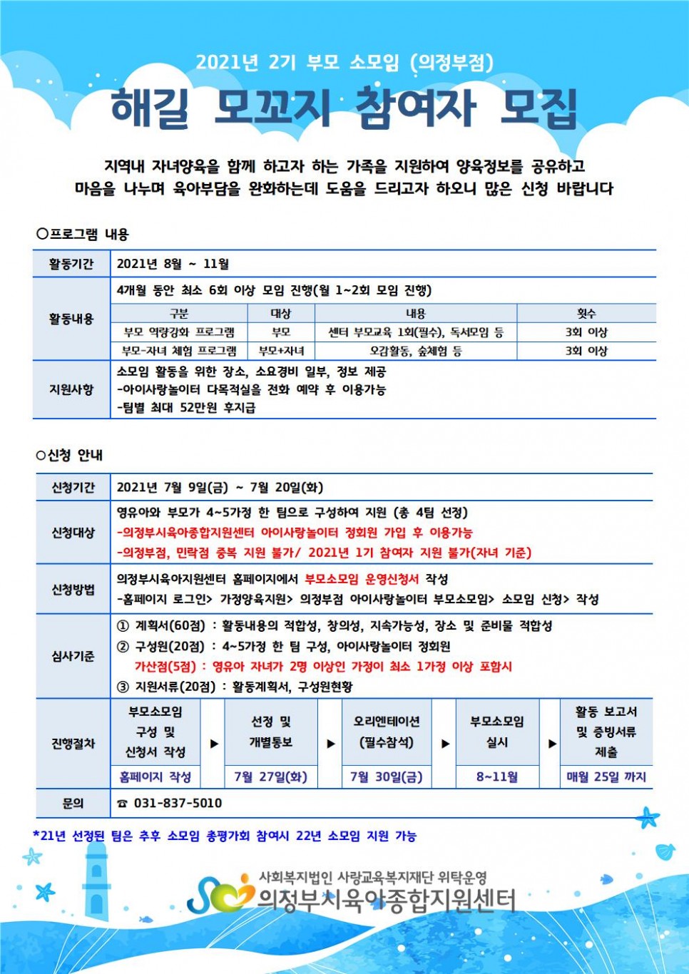 [의정부점] 2021년 2기 부모소모임 "해길모꼬지" 참여자 모집 페이지 정보 작성자 의정부센터 댓글 0건 조회 2,763회 작성일 2021-06-08 09:38 본문 (의정부점) 2021년 2기 부모소모임 "해길모꼬지" 참여자 모집 목록 이전글2021년 상반기 아이사랑놀이터 설문조사 실시(모바일) 21.06.08 다음글(민락점) 2021년 2기 부모소모임 "하랑모꼬지" 참여자 모집 21.06.07