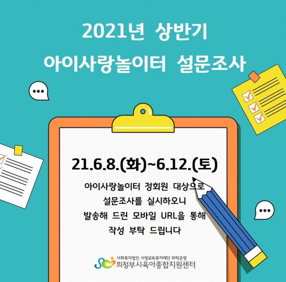 2021년 상반기 아이사랑놀이터 설문조사 실시(모바일) 페이지 정보 작성자 의정부센터 댓글 0건 조회 2,851회 작성일 2021-06-08 10:06 본문 2021년 상반기 아이사랑놀이터 설문조사 실시(모바일) 합니다. 참여자 중 추첨을 통해 소정의 선물을 드리오니 많은 참여 바랍니다. 목록 이전글후기 이벤트 '칭찬을 부탁해' 안내 21.06.09 다음글[의정부점] 2021년 2기 부모소모임 "해길모꼬지" 참여자 모집 21.06.08
