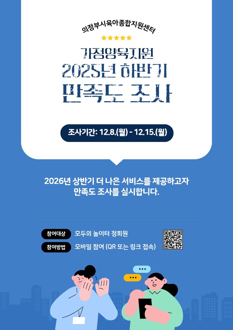 2025년 가정양육지원 하반기 만족도 조사 안내 페이지 정보 작성자 의정부센터 댓글 0건 조회 173회 작성일 2025-12-03 14:09 본문 2026년 더 나은 서비스를 위해 만족도 조사를 실시합니다. 많은 참여 부탁드립니다. 목록 이전글[민락, 의정부] 2025년 12월 장난감 도서관 신규 장난감 입고 안내 25.12.05 다음글★ 양육용품 대여 안내 25.12.03