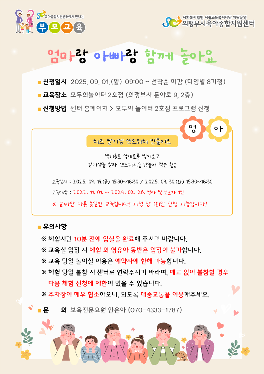 [공통] 엄마랑 아빠랑 함께 놀아요 신청 안내 페이지 정보 작성자 의정부센터 댓글 0건 조회 364회 작성일 2025-08-27 14:49 본문 ※ 모두의 놀이터 정회원 가정 중 해당 연령 영유아 가정만 신청 가능합니다. 목록 이전글[의정부, 롯데맘] 놀이지도사가 알려주는 '9월 놀이코칭 놀이가 쑥쑥' 25.09.01 다음글[롯데맘] 모두의놀이터 3호점 운영시간 변경 안내 25.08.18