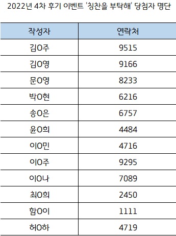 22년 4차 후기 이벤트 '칭찬을 부탁해' 당첨자 명단