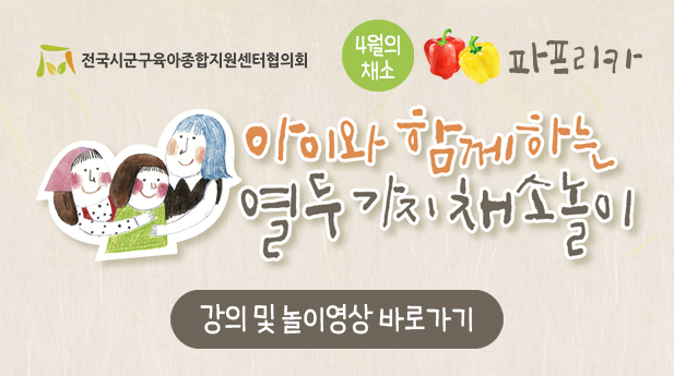 「아이와 함께하는 열두 가지 채소놀이」 4월 파프리카 편 페이지 정보 작성자 의정부센터 댓글 0건 조회 2,293회 작성일 2021-04-05 10:34 관련링크 https://youtu.be/NWQbZ6tQAIM 1826회 연결 본문 ▲관련 링크를 클릭하시면 유튜브 영상을 보실 수 있습니다. 「아이와 함께하는 열두 가지 채소놀이」 4월 파프리카 편 웹진 URL https://aja.mnz.co.kr/7228 목록 이전글<퍼니북> 그림책 '봄이 왔어요' 읽고 활동하기(영아편) 21.04.05 다음글<퍼니북> 그림책 '리키, 너도 구를 수 있어!' 읽고 활동하기(유아편) 21.03.02