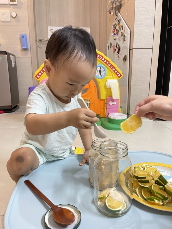 깨끗이 소독 된 유리병에 청귤 슬라이스 담으면