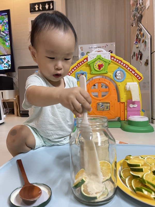 아이가 설탕 숟가락으로 담아 넣어주고 했답니다.