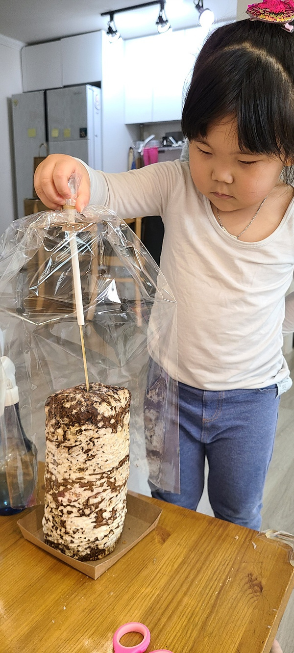아이에게 표고버섯의 사진을 보여주며 이 나무처럼 생긴 배지에서 이런 버섯이 자랄거라고 설명해주었어요.
